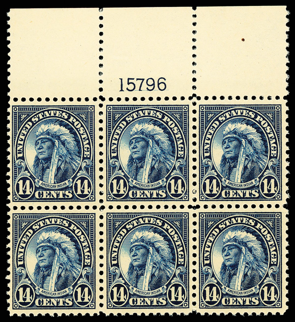7221 nhbl 565 image1923, 14¢ American Indian (Scott 565), top margin plate block of 6, Handsome symmetry, o.g., never hinged, Very Fine to Extremely Fine with several exceptional singles.