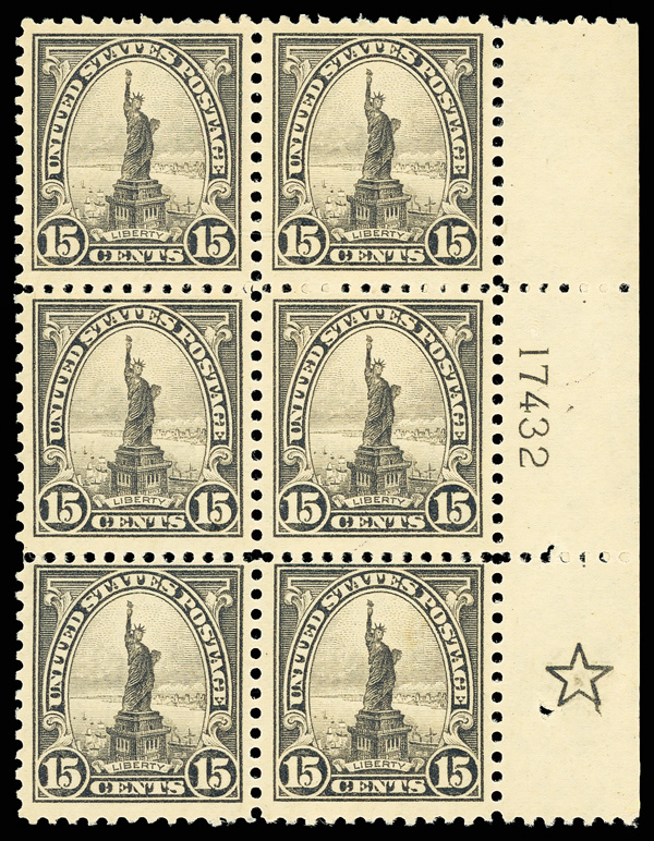 7223 nhbl 566 image1922, 15¢ Statue of Liberty (Scott 566), right margin plate block of 6 and five point star, Richly beautiful impression, o.g., never hinged, Fine to Very Fine.