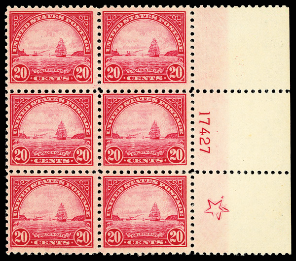 7226 nhbl 567 image1923, 20¢ Golden Gate (Scott 567), right margin plate block of 6 with five point star, Beautifully rich color, o.g., never hinged, Fine to Very Fine.