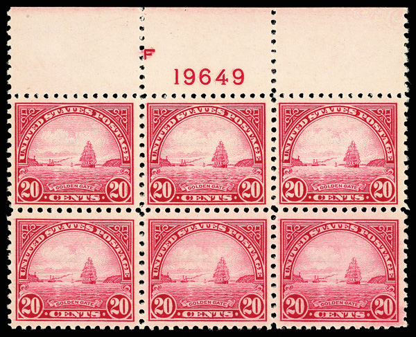 7225 nhbl 567 image1923, 20¢ Golden Gate (Scott 567), top margin plate block of 6, Strikingly deep shade, o.g., never hinged, Very Fine.