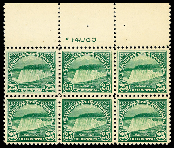7228 nhbl 568 image1922, 25¢ Niagara Falls (Scott 568), top margin plate block of 6, Evenly placed margins, o.g., never hinged, Very Fine.