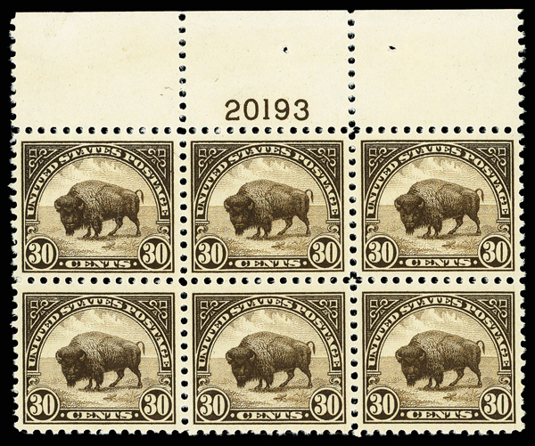 7230 ogbl 569 image1923, 30¢ American Buffalo (Scott 569), top margin plate block of 6, Handsome rich shade, o.g., lightly hinged, Very Fine.