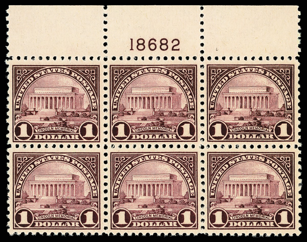 7233 nhbl 571 image1923, $1 Lincoln Memorial (Scott 571), top margin plate block of 6, Radiant vibrant color, o.g., never hinged, Very Fine.