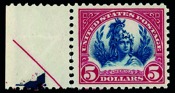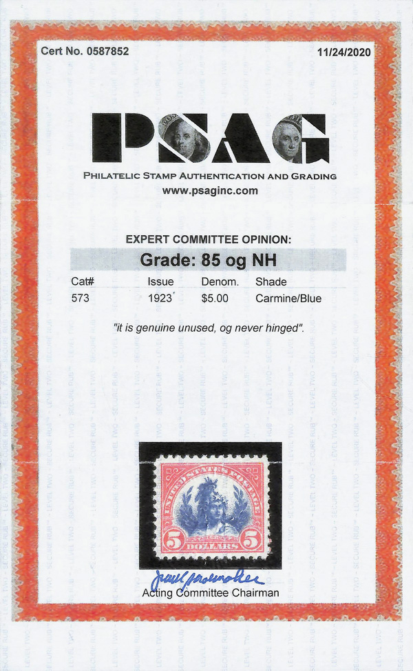 7235 nh 573 image1923, $5 America (Scott 573), o.g., never hinged, Very Fine to Extremely Fine, with 2020 P.S.A.G. certificate graded XF-SUP 95.