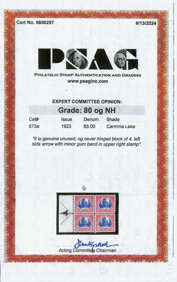 7236 nh 573a image1923, $5 America, carmine lake & dark blue (Scott 573a), o.g., never hinged, Very Fine, with photocopy of 2024 P.S.A.G. certificate graded VF 80 for block.