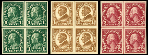 7237 nhbl 575-577 image1923-25, flat plate imperfs., 1¢ to 3¢ complete (Scott 575-577), set of 3, centerline blocks of 4, o.g., never hinged, Very Fine.