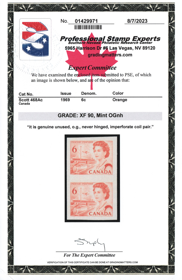 8561 nh 468Ac image1969, 6¢ Queen Elizabeth II & Transportation coil, orange, imperf (Scott 468Ac), a choice vertical air, o.g., never hinged, large balanced margins and brilliant color, Extremely Fine, with a 2023 P.S.E. certificate graded XF 90.