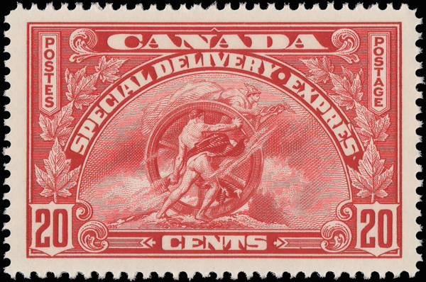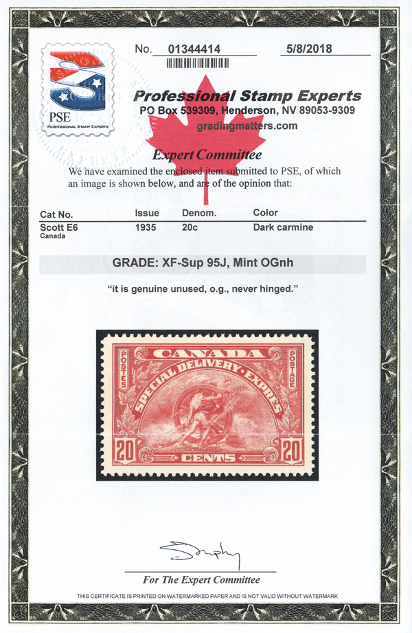 8562 nh E6 imageSpecial Delivery, 1935, 20¢ dark carmine (Scott E6), an fantastic mint example, o.g., never hinged, post office fresh and perfectly centered with extra wide margins, Extremely Fine to Superb, with a 2018 P.S.E. certificate graded XF-SUP 95.