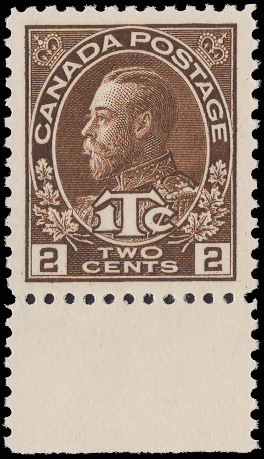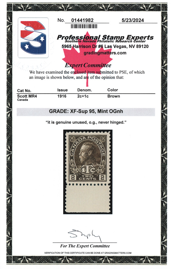 8568 nh MR4 imageWar Tax, 1916, King George V "Admiral", 2¢+1¢ brown, type II (Scott MR4), an absolutely gorgeous bottom sheet margin single, o.g., never hinged, post office fresh and perfectly centered with beautifully balanced margins, Extremely Fine to Superb, with a 2024 P.S.E. certificate graded XF-SUP 95.
