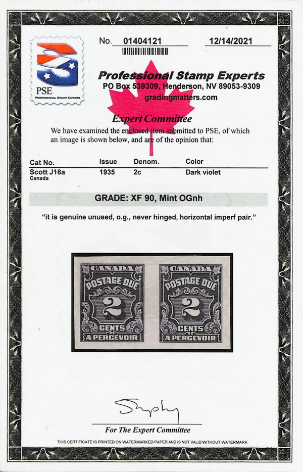 8564 nh J16a imagePostage Due, 1935, 2¢ dark violet, imperforate pair (Scott J16a), o.g., never hinged, fresh and bright horizontal pair, sound with full margins all around, Extremely Fine, only 100 pairs issued, with 2021 P.S.E. certificate graded XF 90.