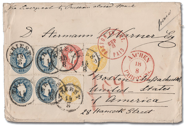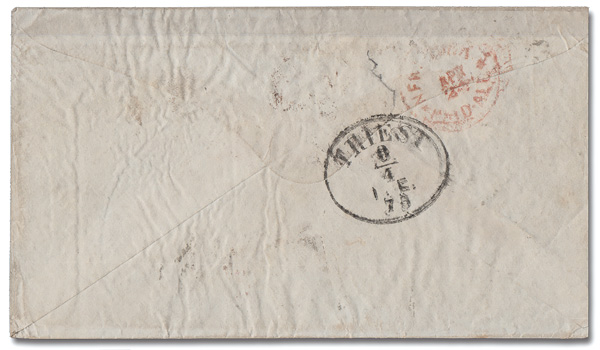 8579 cover 12 (2), 14, 16 (4) image1860, Franz Joseph, Three-Color franking (Scott 12 (2), 14, 16 (4)), cover from Triest to Boston via Aachen, Aug 15-Sep 3, 1861 (year date in docketing on the reverse); franked with two 2kr, one 5kr and two pairs of the 15kr; all markings on the front, Very Fine.