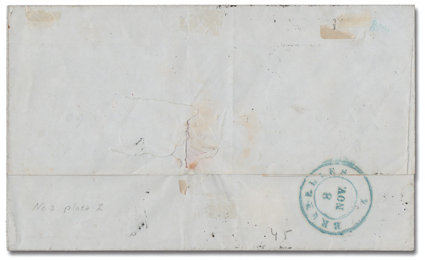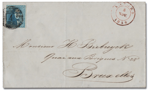 8583 cover 2 image1849, 20c blue (Scott 2), nice margins and bright color, tied by a neat numeral cancel "4" on an exceptionally clean folded cover from Antwerp to Brussels; red Antwerp c.d.s. and blue Brussels backstamp, both Nov 8, 1849, Extremely Fine.