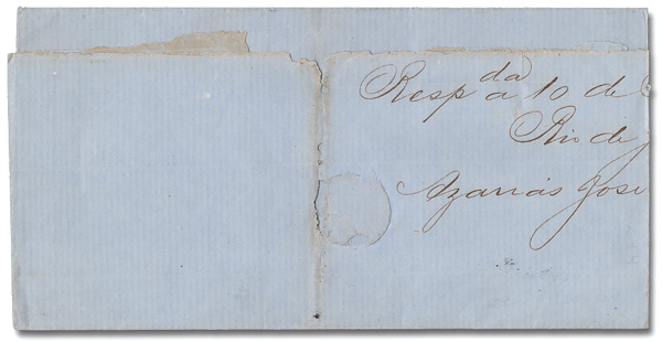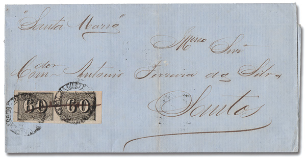 8590 cover 24 image1850, Numeral Issue, imperf, 60r black (Scott 24), Very Fine 4-margin horizontal pair tied on an 1865 folded letter fron Rio de Janeiro to Santos, Very Fine. (Image) (Image2) (All Images)