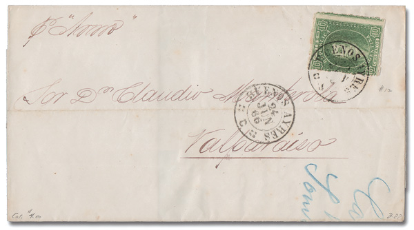 8572 cover 12 image1864, Rivadavia, watermarked, perf 11½ 10c green (Scott 12), tied by one of two strikes Buenos Aires c.d.s.s, Jun 22, 1866, on a clean folded cover to Valparaiso, Very Fine.