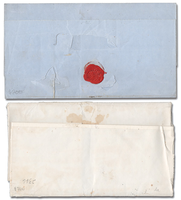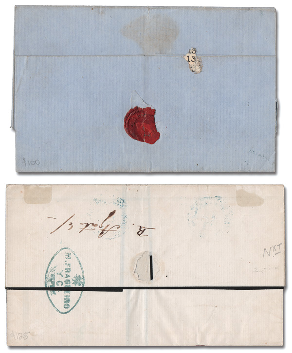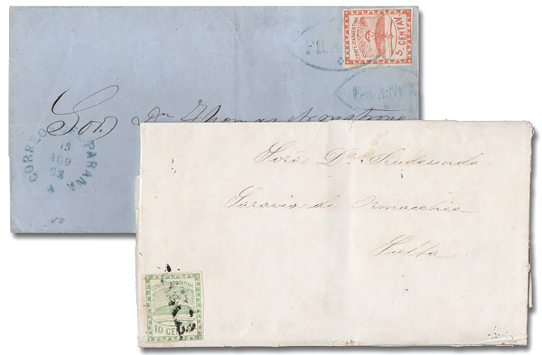 8569 cover 1 image1858, Confederation, 5c red (Scott 1), 1.) 5c red tied by two blue FRANCA elipses on a clean folded cover with a clear Correo del Parana rimless c.d.s., Aug 15, 1862; Very Fine; and 2.) 10c green tied by weak straightline FRANCA on folded letter to Salta; several internal and edge separations; Fine. (Image) (Image2) (All Images)