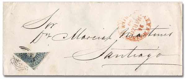 8592 cover 10n image1856, Columbus, 10c dark blue, very worn plate, half bisect (Scott 10n), watermark e, lower left diagonal half tied by a light target cancel on a small cover from Valparaiso to Santiago with a mostly complete Valparaiso c.d.s., Mar 24, 1858, Fine to Very Fine.