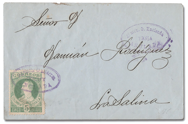8598 cover 1 image1902, Diego Mendoza Pérez, 5c blue green, perf. 13½ (Scott 1), tied by a violet "Agencia G…/ Cocuy/ Anulada" oval on a small, neat cover tp La Salina, with a second violet oval, this one "…G. Hacienda/ Tunja/ Anulada, Very Fine. (Image) (Image2) (All Images)