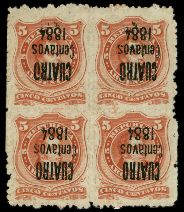 8576 ngbl 51a image1884, 4c on 5c vermillion Rivadavia inverted surcharge in black (Scott 51a), block of 4, unused without gum, Fine to Very Fine.