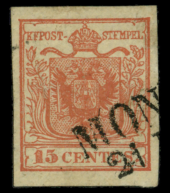 8581 O 4b image1850 Arms 15c red, hand-made paper, type I (Scott 4b), single, Extremely Fine to Superb.