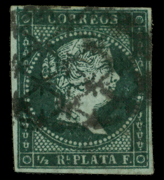 8600 O 1 image1855, Queen Isabella II, ¼r blue green on blue paper (Scott 1), single, Very Fine.