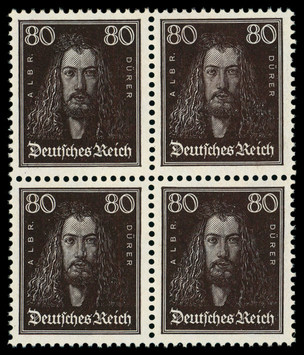 8632 nhbl 362 image1926, 80pf chocolate Albrecht Durer (Scott 362), block of 4, o.g., never hinged, Extremely Fine.