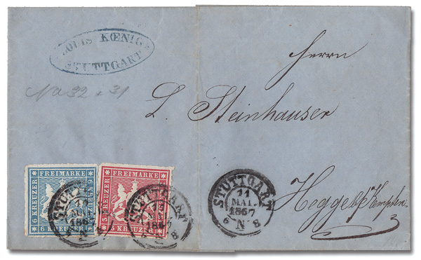 8631 cover 42-43 image1865, 3kr rose & 6kr blue (Scott 42-43), rouletted, tied by two of three Stuttgart c.d.s.s, May 11, 1867, on a clean folded cover to Heggebach/Kempenich; backstamped Kempenich the next day, Very Fine.