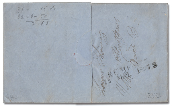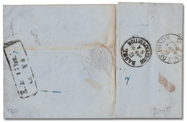 8628 cover 7-8 image1857, 2sgr blue & 3sgr orange (Scott 7-8), 4-margin singles tied by Düren c.d.s.s, Jan 16, 1860, on a folded cover to Chaux de Fonds, Switzerland; backstamped Base, Jan 17, and Chaux de Fonds, Jan 18, Fine to Very Fine.