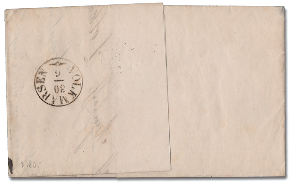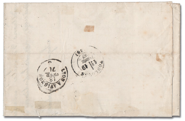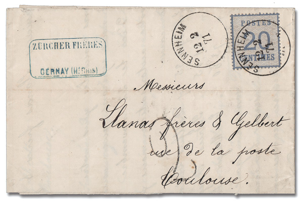 8626 cover N13 imageAlsace-Lorraine, 1870, 20c ultramarine, burelage reversed (Scott N13), beautifully well centered, tied by one of two strikes Sennheim c.d.s., Feb 12, 1871 on a folded letter to Toulouse; backstamped Lyon a Avignon, Feb 18, and Toulouse, Feb 19, Very Fine.