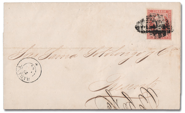 8603 cover 15 image1860, Queen Isabella II, "Y¼"r on 2r dull rose (Scott 15), four clear margins tied by a light oval grid on a clean local Havana folded cover; Havana c.d.s. not clearly struck up, otherwise Very Fine.