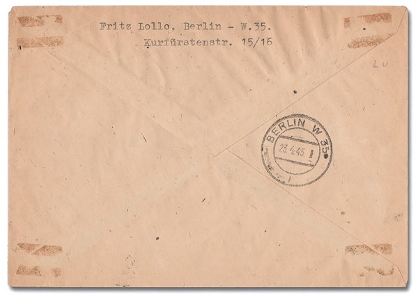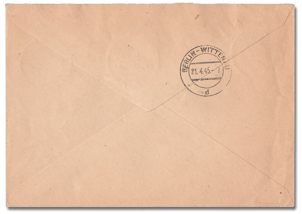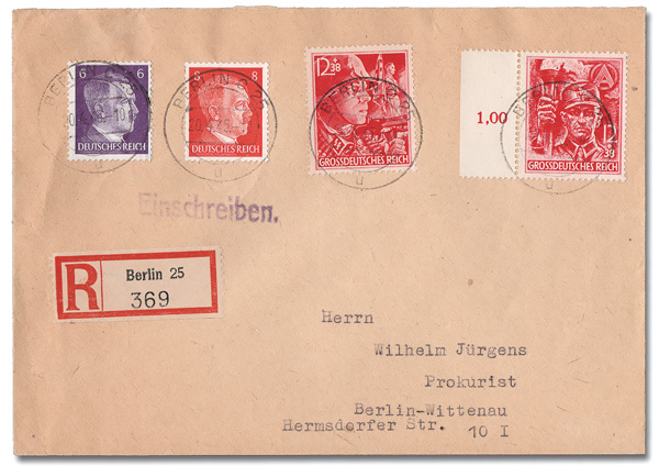 8635 cover B292-B293 image1945 Storm Trooper complete (Scott B292-B293), used with two 3pf and an 8pf Hitlerhead on a Registered local cover canceled Berlin W35 c.d.s. Apr 23, 1945 and backstamped with a different Berlin C35 c.d.s. the same day; light horizontal crease not affecting stamps, otherwise Very Fine.