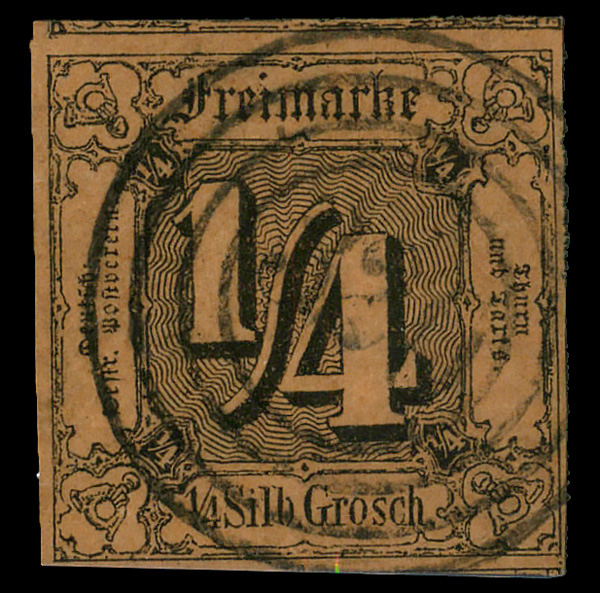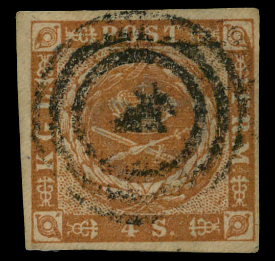 8609 O 4a image1854, Royal Emblems, 4sk yellow brown (Scott 4a), single, Numerical cancel 4., Very Fine.
