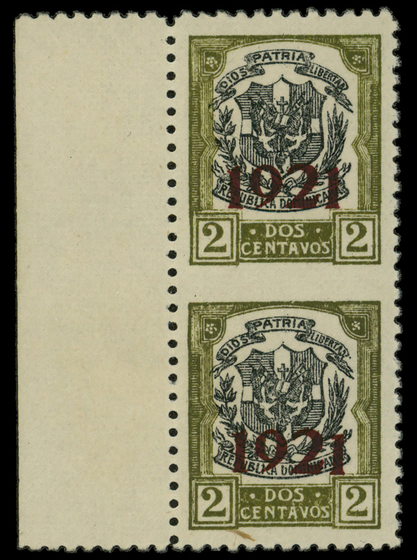 8616 nh 228a image1921, 2c olive & black Coat of Arms overprinted 1921 in red (Scott 228a), vertical pair imperf between, o.g., never hinged, Extremely Fine.