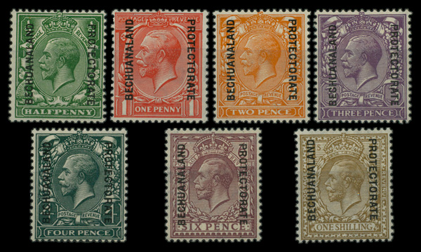 9375 og 96-104 image1925-27, "Bechuanaland Protectorate" on Great Britain (King George V), ½d to 1s complete (Scott 96-104), complete set of singles, o.g., hinged, Fine to Very Fine.
