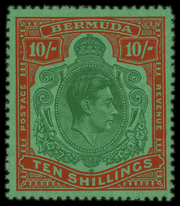 9379 og 126b image1939, King George VI, 10s bluish green & deep red on green, perf. 14, chalky paper (Scott 126b), single, o.g., lightly hinged, Fine to Very Fine.