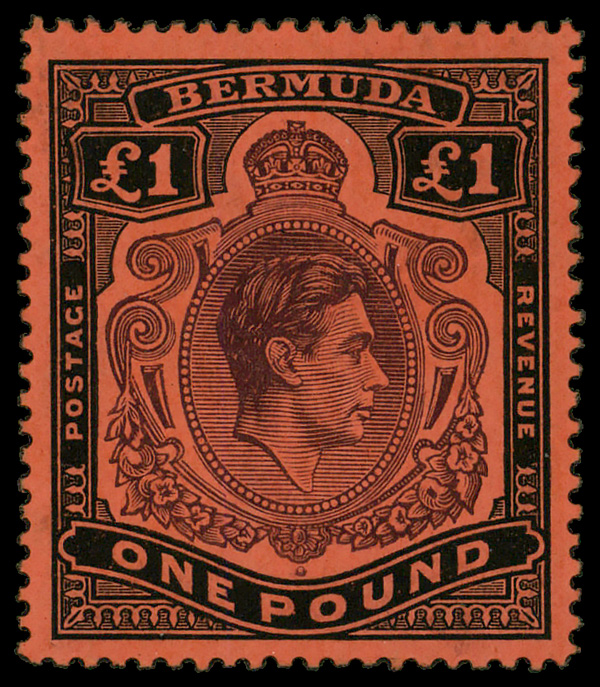 9380 og 128b image1941, King George VI, £1 purple & black on red, perf. 14, "ER" joined (Scott 128b), single, o.g., hinged, Fine to Very Fine.