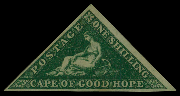 9387 ng 6a image1858, Triangular, Perkins Bacon printing, 1s deep dark green on white paper (Scott 6a), single, unused without gum, Fine to Very Fine.