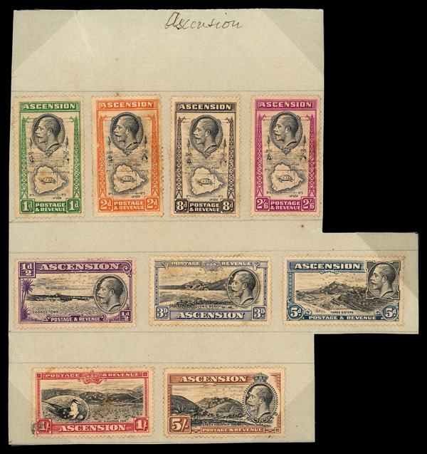 9365 S 23-32 vars. image1934, King George V Pictorial, ½d-5s, missing 1½d, overprinted "Specimen" (Scott 23-32 vars.), stuck down to ledger piece; slightly discolored with minor faults, Very Fine.