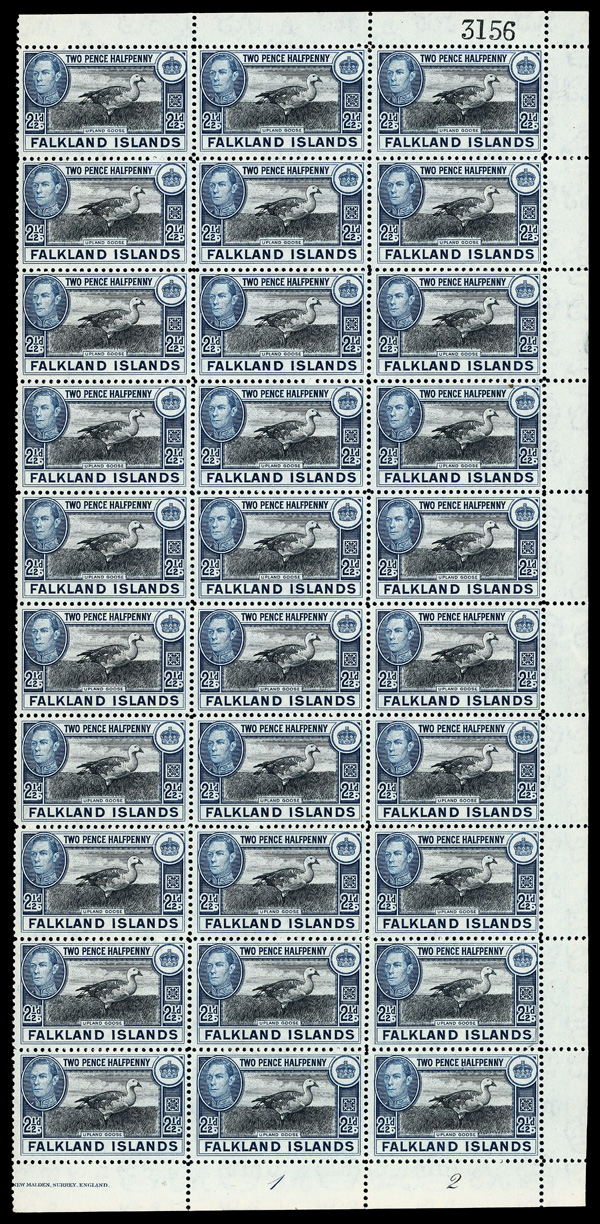 9398 nhbl 101 image1948, King George VI, 2½d black & blue (Scott 101), plate block of 30 with registration number & partial imprint, o.g., never hinged, Very Fine.