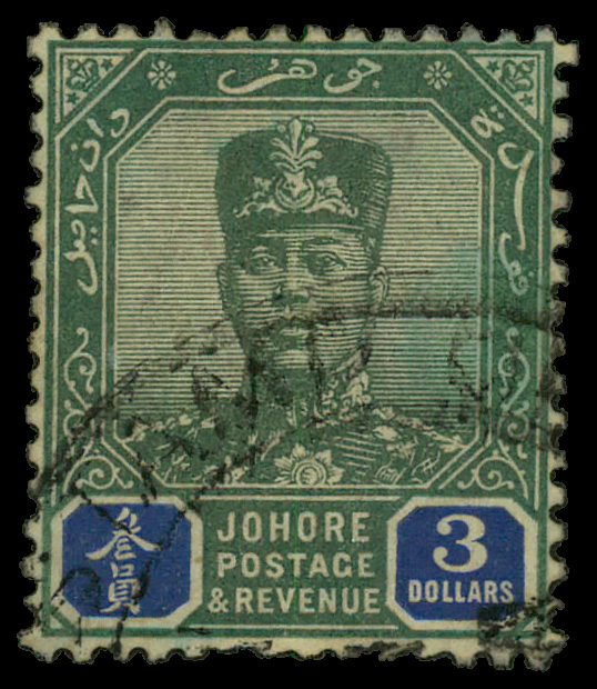 9413 O 70 image1904, Sultan Ibrahim, $3 green & blue (Scott 70), watermarked Rosette, single, Fine to Very Fine.