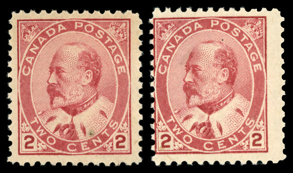 9491 og 90e image1903, King Edward VII, 2¢ carmine, type I (Scott 90), two, o.g., lightly hinged (one with paper inclusion), Fine to Very Fine.