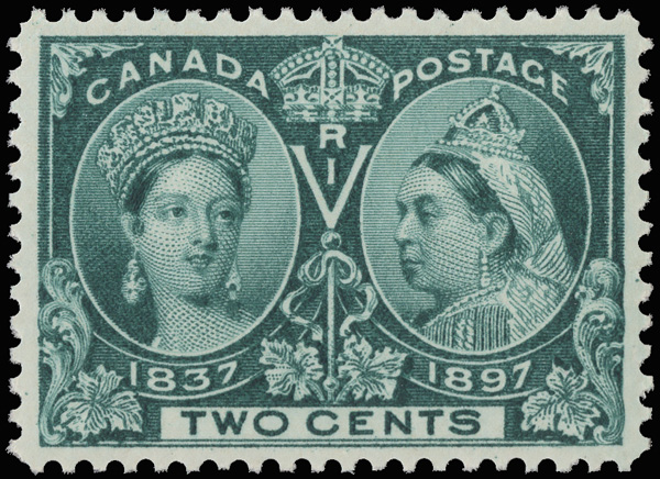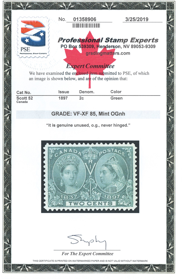 9481 nh 52 image1897, Queen Victoria Jubilee, 2¢ green (Scott 52), a choice, perfectly centered mint example, o.g., never hinged, Very Fine to Extremely Fine, with a 2019 P.S.E. certificate graded VF-XF 85 (undergraded, in our opinion).