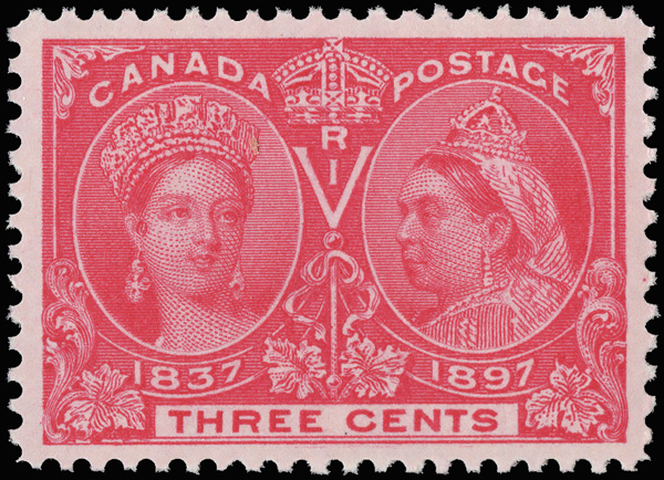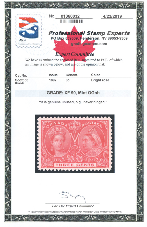 9482 nh 53 image1897, Queen Victoria Jubilee, 3¢ bright rose (Scott 53), o.g., never hinged, exceptionally well centered with gorgeous color, Extremely Fine, with a 2019 P.S.E. certificate graded XF 90.
