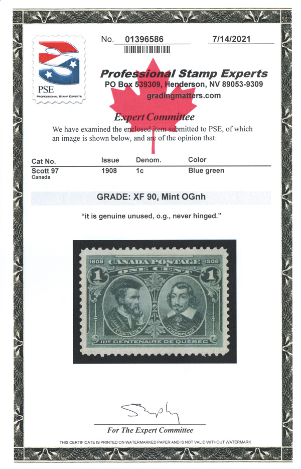 9494 nh 97 image1908, 1¢ Quebec Tercentenary (Scott 97), a choice mint single, o.g., never hinged, fresh and bright with generous, well beautifully balanced margins, Extremely Fine, with a 2021 P.S.E. certificate graded XF 90 (undergraded, in our opinion).