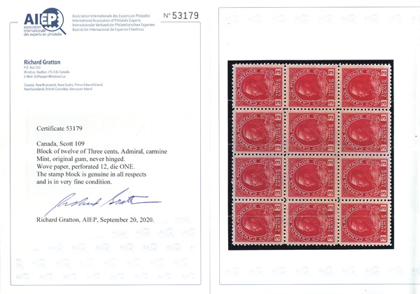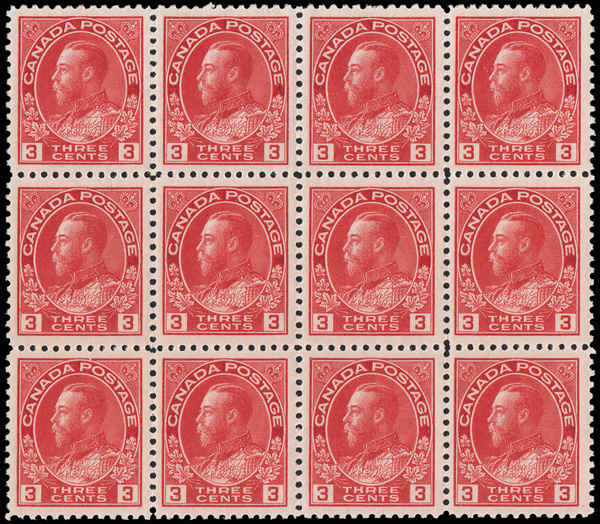 9504 nhbl 109 image1923, King George V "Admiral", 3¢ carmine, type I (Scott 109), a choice, exceptionally well centered block of 12, o.g., never hinged, Very Fine to Extremely Fine. The left half of the block is particularly nice, with a 2020 Gratton certificate as Very Fine.