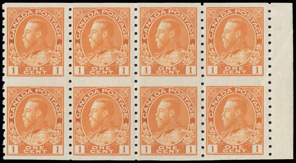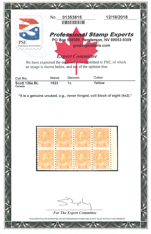 9519 nhbl 126a image1923, King George V "Admiral", 1¢ yellow, type II, dry printing, horizontal coil, perf. 8 vertically (Scott 126a), right sheet margin block of 8, o.g., never hinged, well centered with marvelous color, Very Fine, with a 2018 P.S.E. certificate.