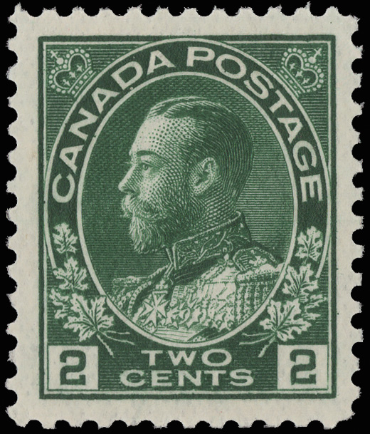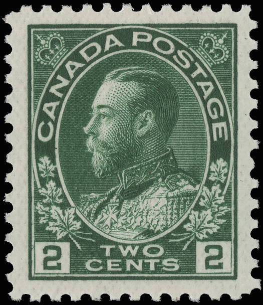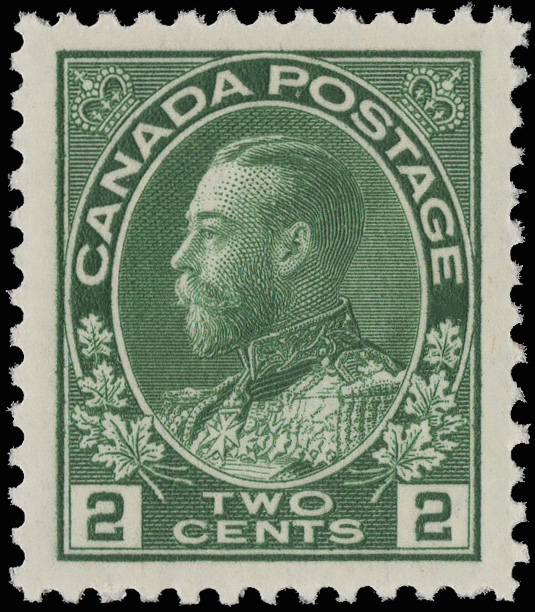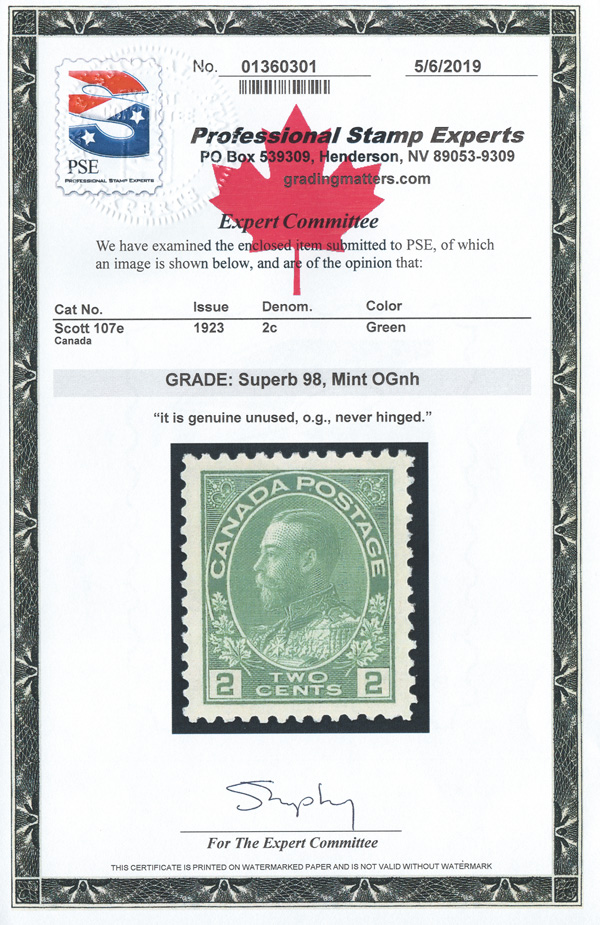 9502 nh 107e image1923, King George V "Admiral", 2¢ green, dry printing (Scott 107e), a fabulous mint single, o.g., never hinged, post office fresh and mathematically centered, Superb. 107e is unpriced by SMQ, with a 2019 P.S.E. certificate graded SUP 98.