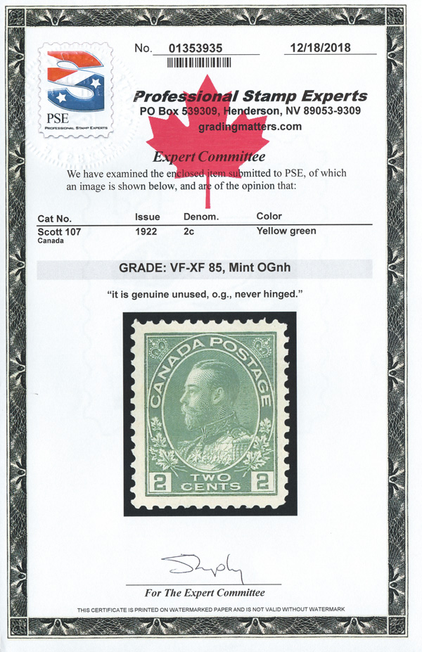9500 nh 107 image1922, King George V "Admiral", 2¢ yellow green, wet printing (Scott 107), o.g., never hinged, fresh and well centered, Very Fine to Extremely Fine, with a 2018 P.S.E. certificate graded VF-XF 85.