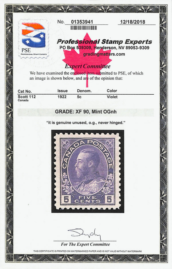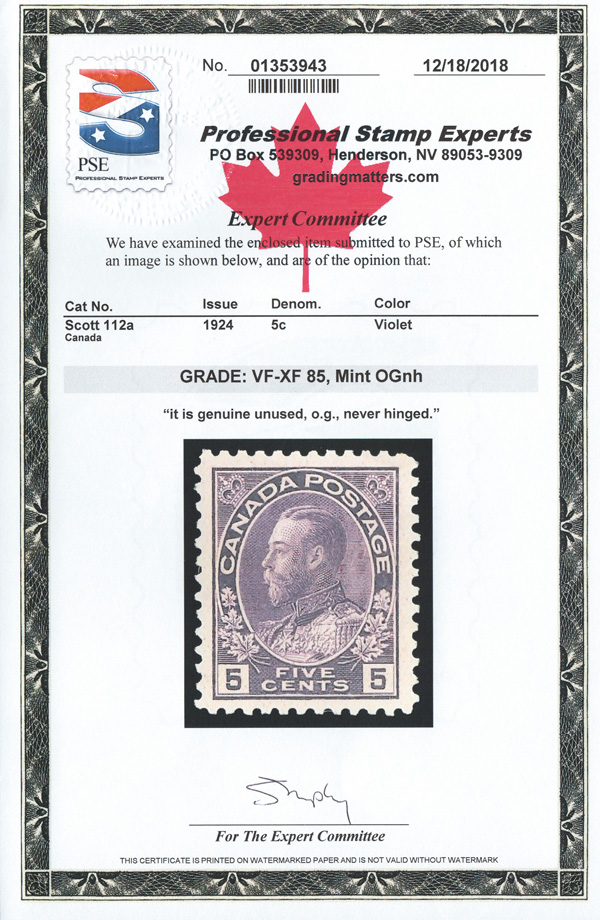 9509 nh 112a image1924, King George V "Admiral", 5¢ violet, thin paper, wet printing (Scott 112a), o.g., never hinged, fresh and very well centered, Very Fine to Extremely Fine, with a 2018 P.S.E. certificate graded VF-XF 85.
