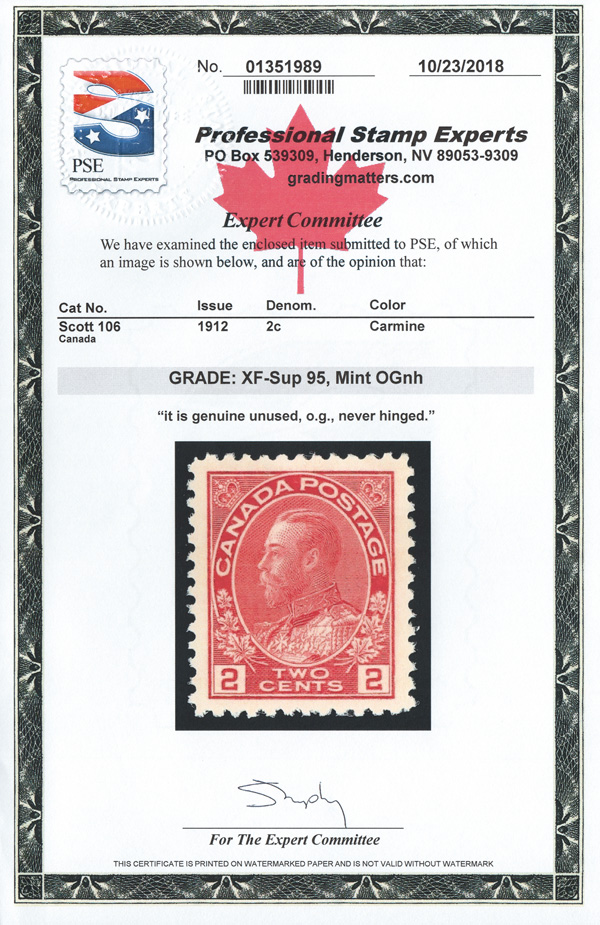 9498 nh 106 image1912, King George V "Admiral", 2¢ carmine (Scott 106), o.g., never hinged, post office fresh and perfectly centered, Extremely Fine to Superb, with a 2018 P.S.E. certificate graded XF-SUP 95.