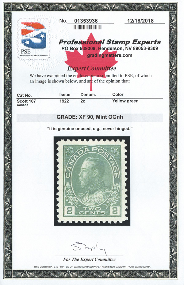9501 nh 107a image1924, King George V "Admiral", 2¢ yellow green, thin paper, wet printing (Scott 107a), o.g., never hinged, Extremely Fine, with a 2018 P.S.E. certificate graded XF 90, mistakenly identifying it as ordinary paper.